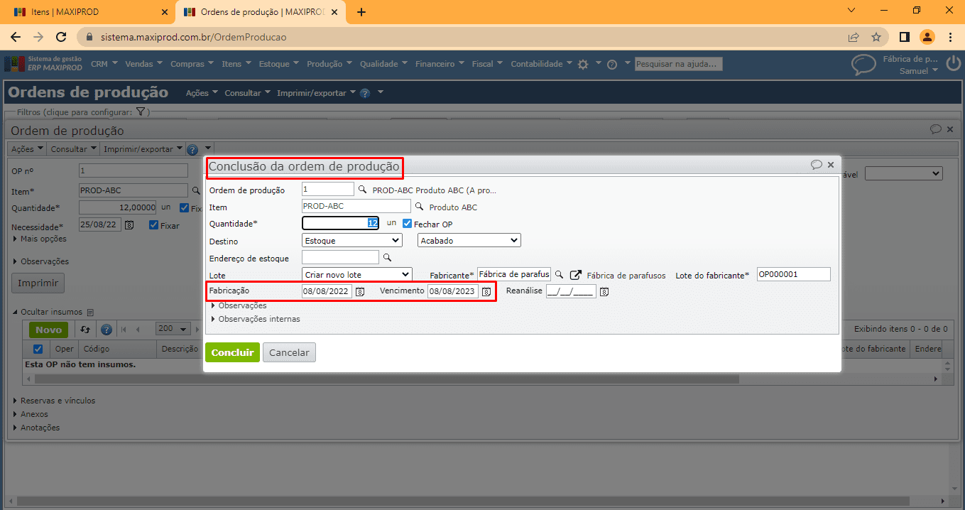5) Agora, ao concluir uma ordem de produção cujo item produzido seja estocado por “Lote do fabricante”, o sistema preencherá automaticamente os campos “Fabricação” e “Vencimento” do lote criado.