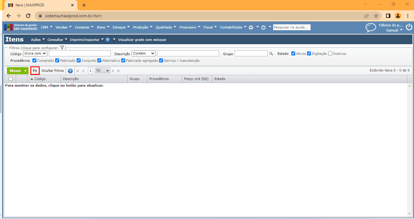 2) A seguir, clique no botão “Atualizar”, conforme destacado na imagem abaixo, para o sistema carregar os itens já cadastrados. Busque o item através dos filtros “Código” ou “Descrição” ou clique no botão verde “Novo” para cadastrar um novo item.