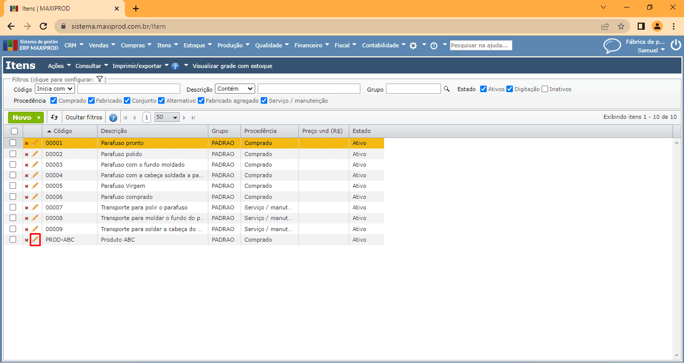 3) Para editar um item já cadastrado, clique no ícone do “lápis”, ao lado do código do item.