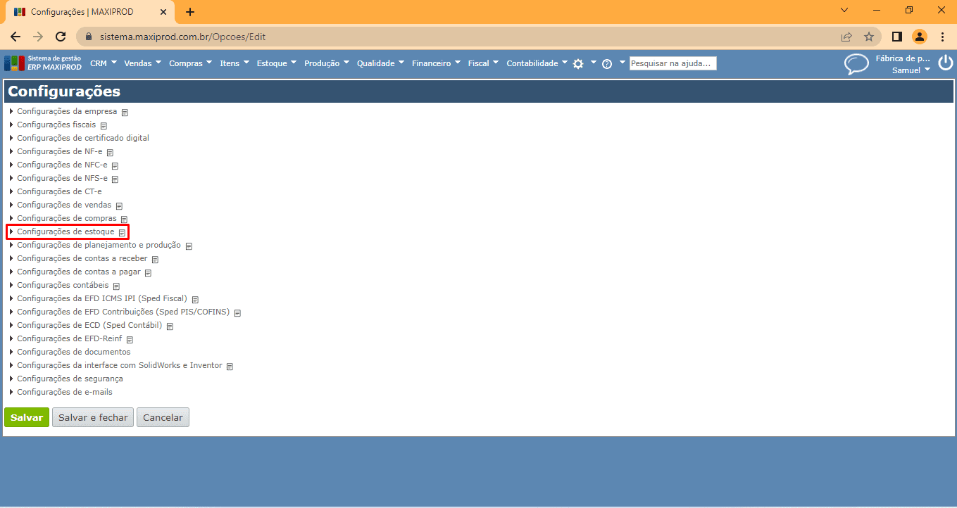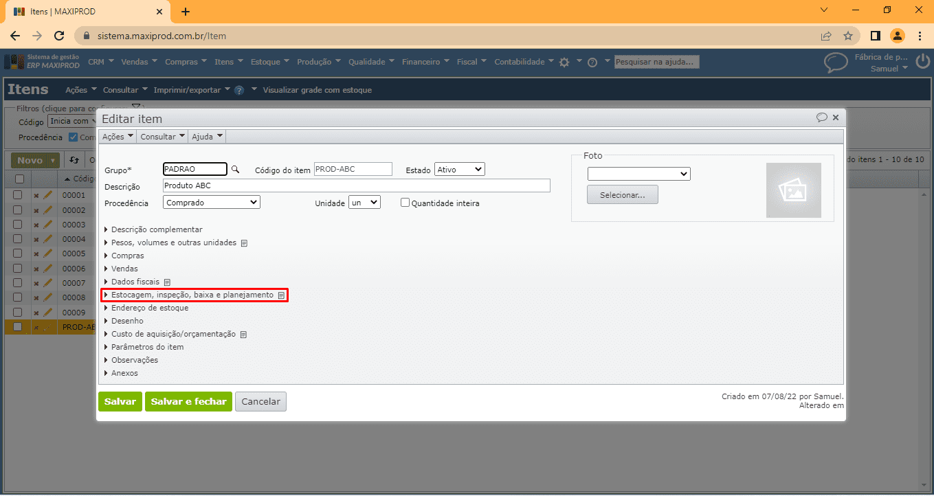 4) Na tela de edição do item, expanda a aba “Estocagem, inspeção, baixa e planejamento”.