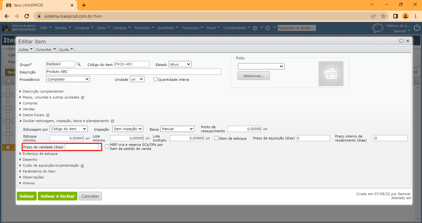 O prazo de validade é o período de tempo durante o qual os alimentos ou outros produtos perecíveis estão íntegros e seguros para o consumo. Esse período inicia na data de fabricação do produto e se estende até que a qualidade definida pela mercadoria esteja fora dos padrões esperados para as condições de distribuição, armazenamento e consumo. O prazo de validade é definido no cadastro do item.