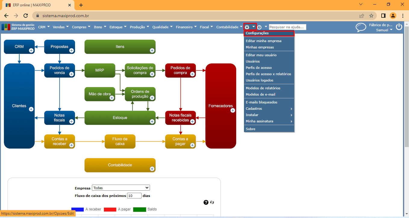 1) Acesse o menu superior “Roda dentada > Configurações”, conforme imagem abaixo.