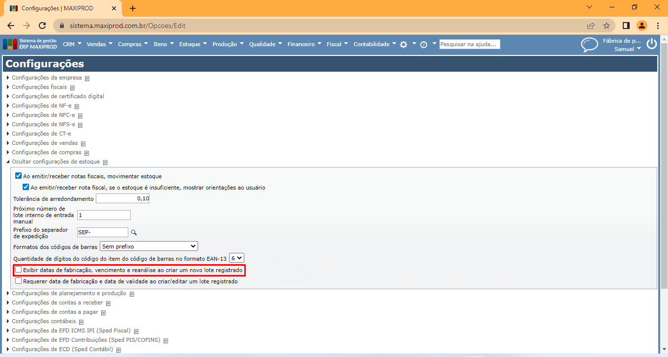 3) Marque a caixa de seleção da opção “Exibir datas de fabricação, vencimento e reanálise ao criar um novo lote registrado”.