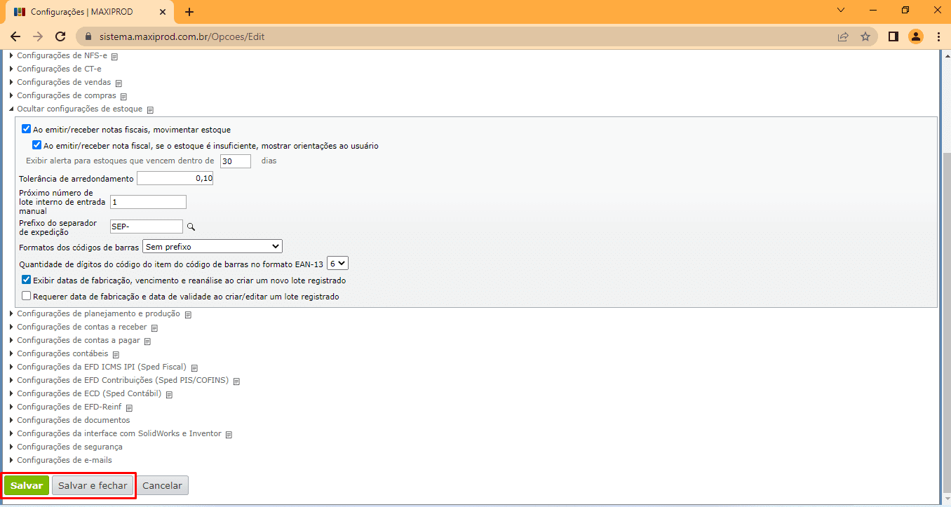 2) A seguir, expanda a aba “Configurações de estoque”.