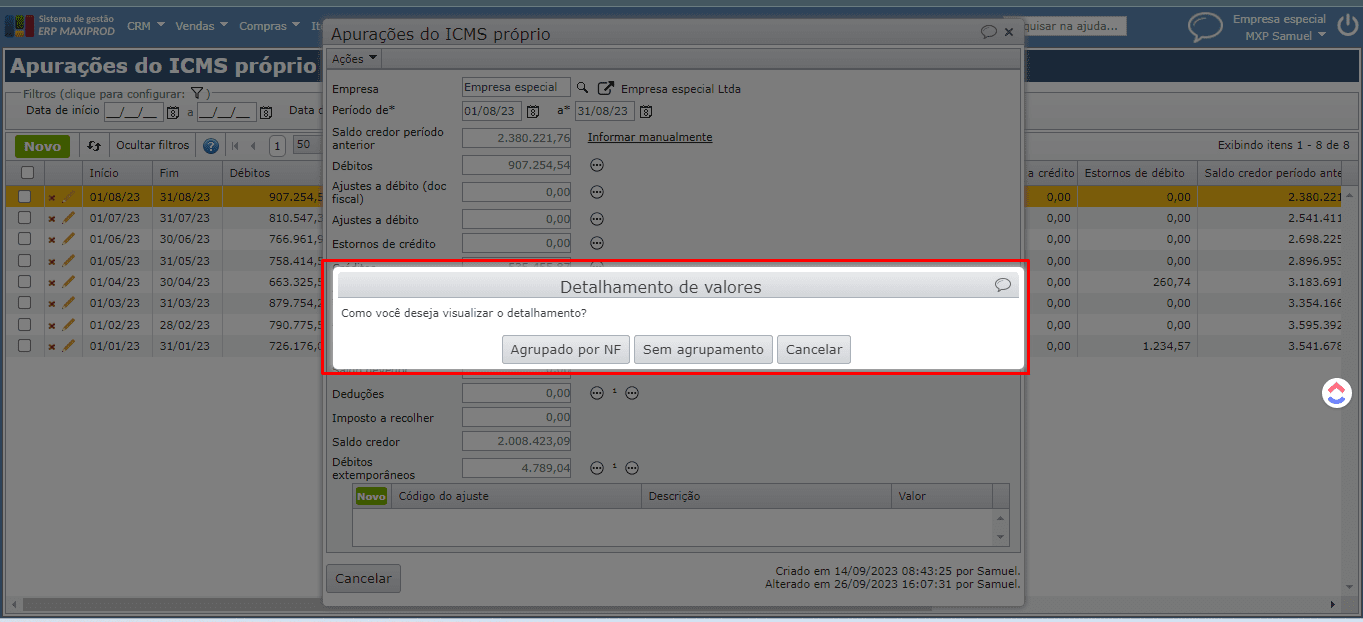 8) Em seguida, acesse a apuração do ICMS “Fiscal > Apurações > ICMS próprio”, edite a apuração do ICMS do período correspondente e clique em “Ações > Recalcular”.