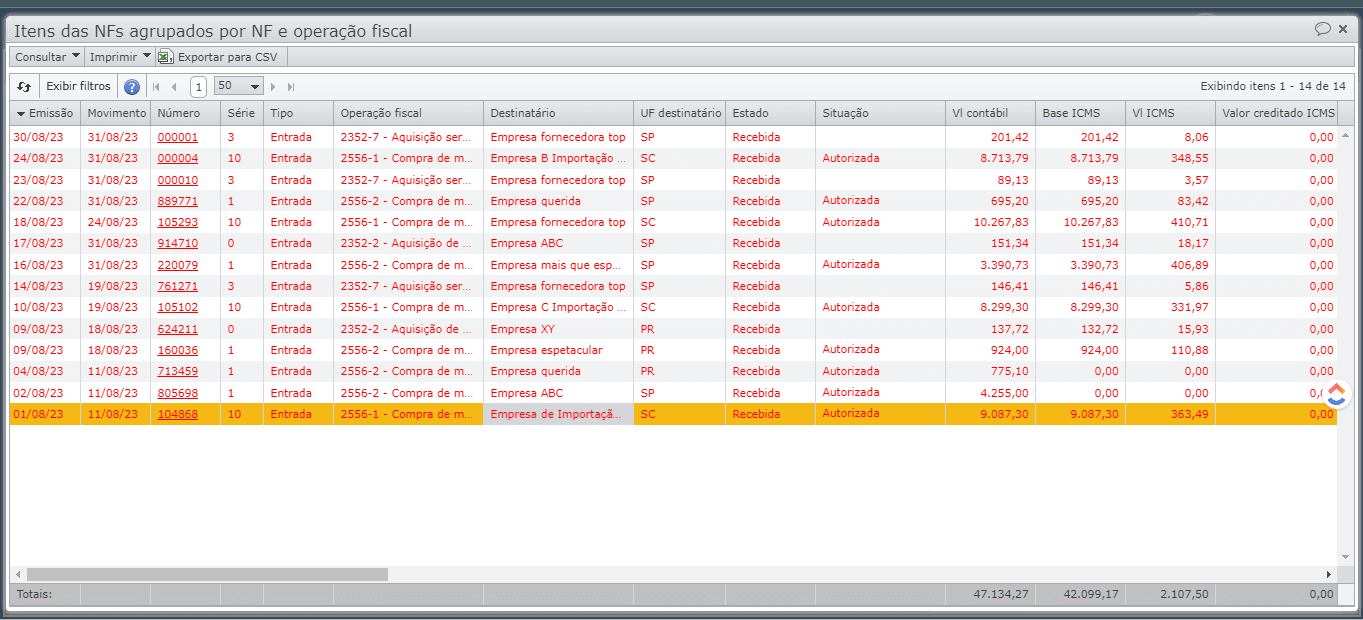 4) Ao clicar na opção “Agrupado por NF” será aberta a seguinte janela, detalhando os itens das notas agrupados pelas NFs e operação fiscal.