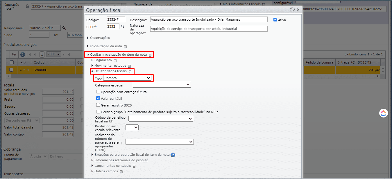 6) O tipo da operação fiscal é encontrado na edição da operação fiscal, seção “Inicialização do item da nota” , aba “Dados fiscais” e campo “Tipo”. Portanto, se estiver diferente de “Compra”, é necessário alterar para “Compra”.