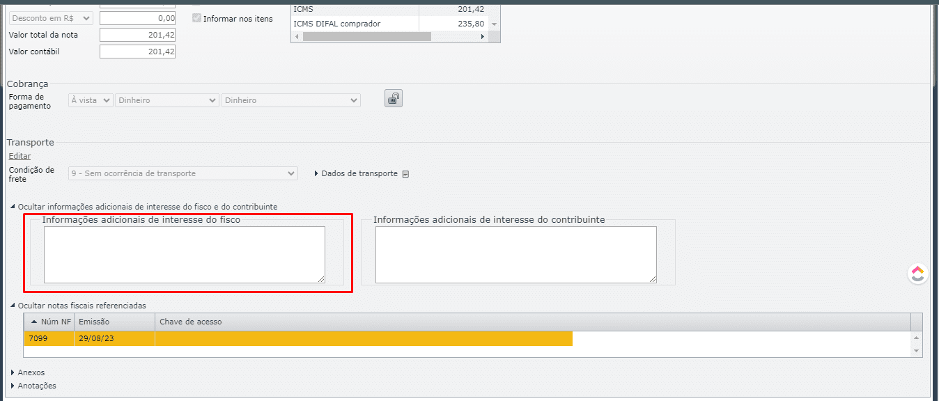 7) É necessário preencher nas notas que aparecem discriminadas em “Débitos extemporâneos” da apuração de ICMS o campo “Informação adicional de interesse do fisco”. O recomendado é que preencha este campo com a normativa legal que permite a utilização do código do ajuste informado na edição do imposto “ICMS DIFAL comprador”.