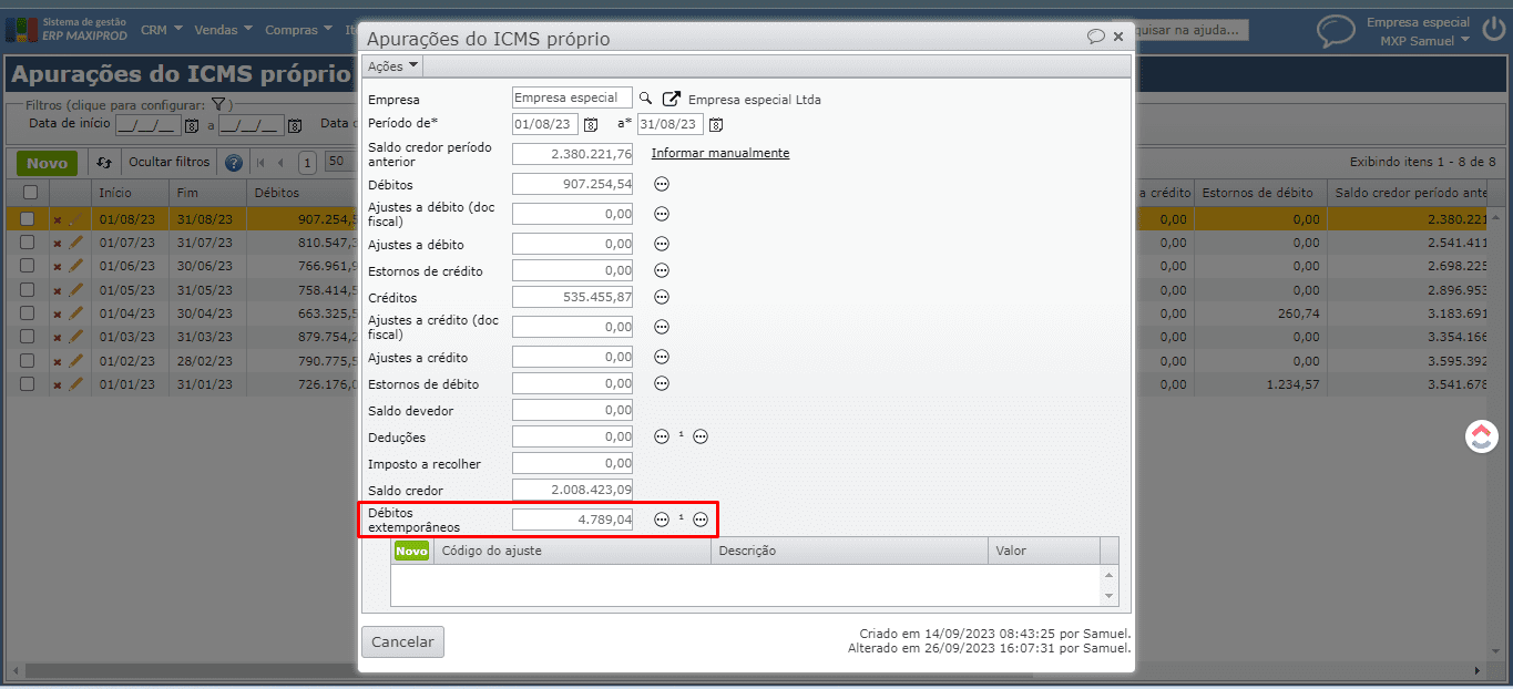 2) Na edição da apuração, verifique a seção “Débitos extemporâneos”, provavelmente, é onde estarão os documentos que compões estes registros. Clique sobre os primeiros três pontinhos “…” ao lado do campo, para ser aberta a janela com o detalhamento dos documentos fiscais.