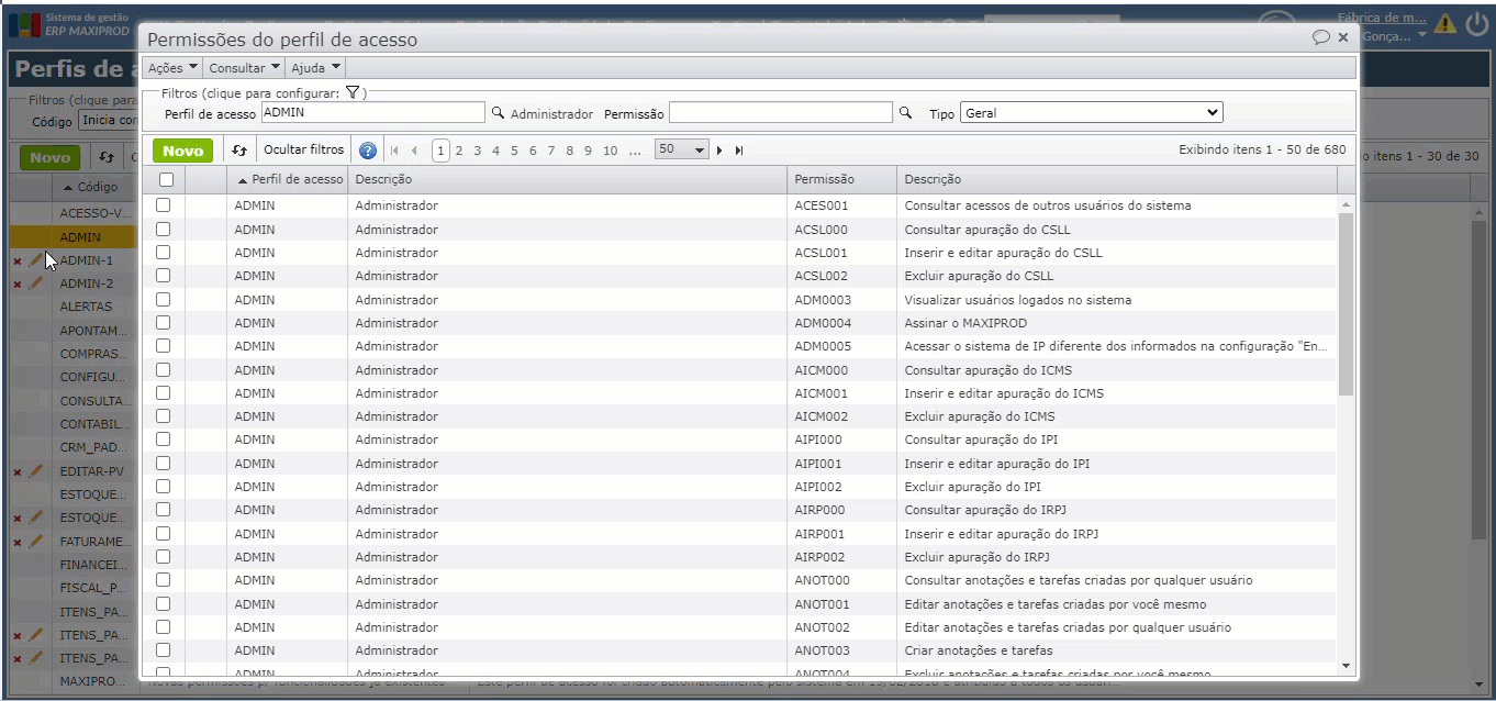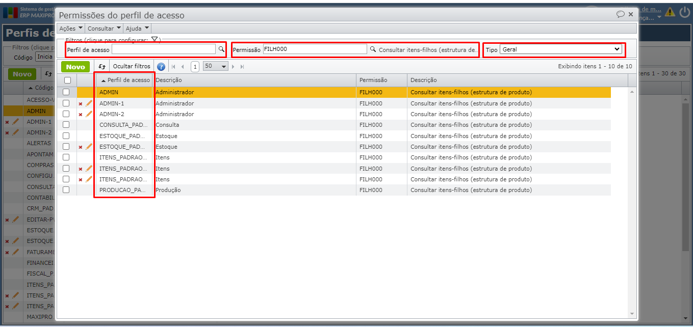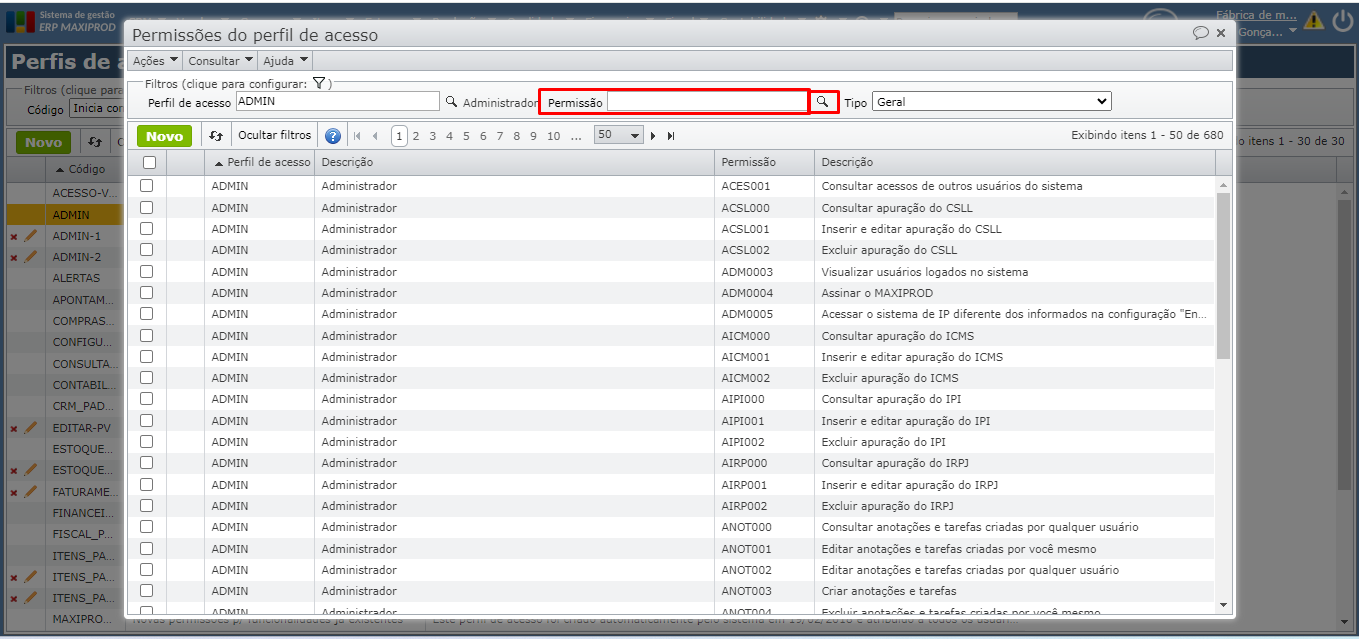 4) Ao filtrar pela permissão, com o filtro “Perfil de acesso” limpo, o sistema exibe os perfis de acesso que possuem essa permissão. Porém, a consulta é feita por “Tipo”: escolha entre “Geral”, “Exclusivo de vendas” ou “Exclusivo de apontamento de operações”.