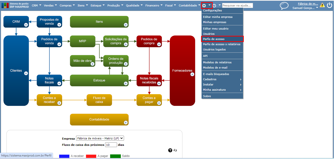 1) Acesse o menu superior “Roda dentada > Perfis de acesso”.
