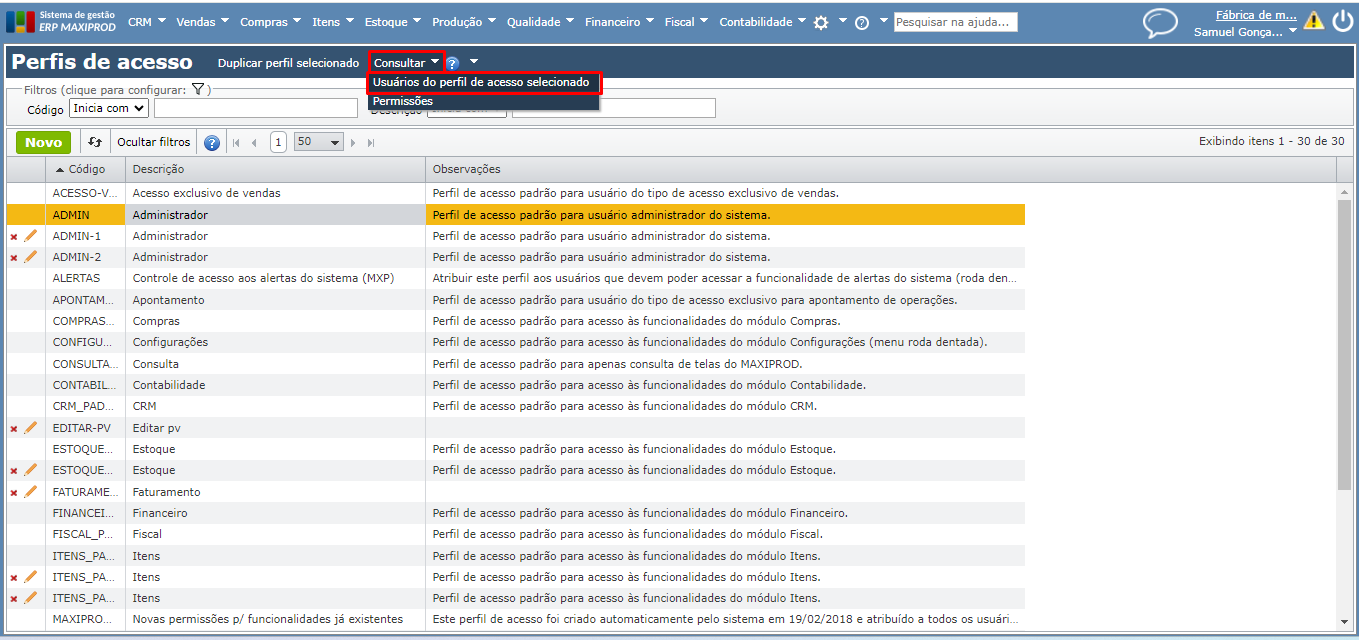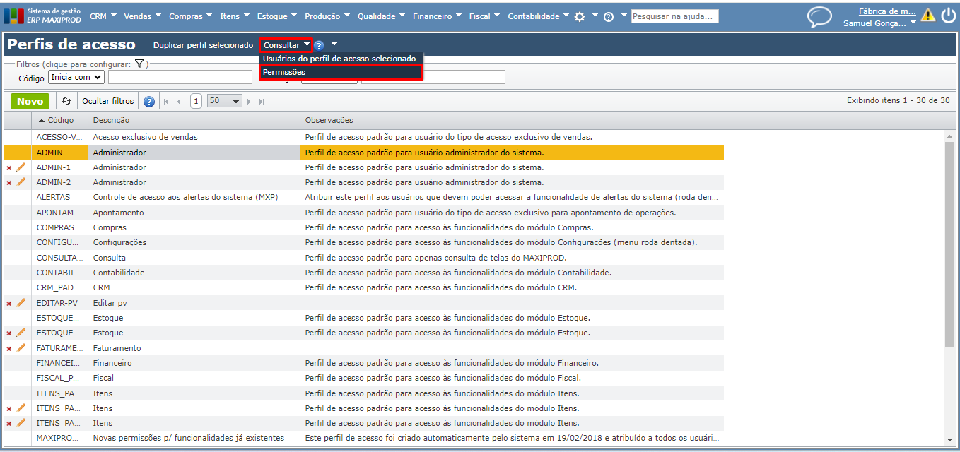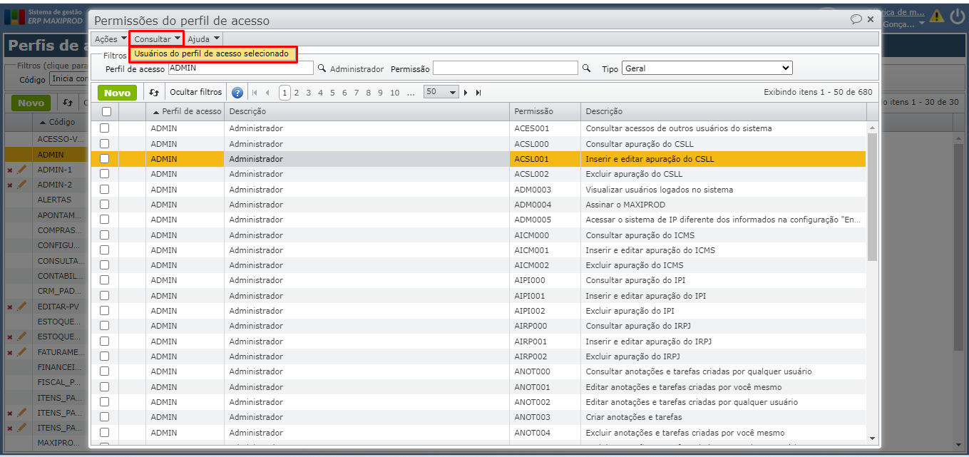 4) A consulta também pode ser feita através da tela de permissões do perfil de acesso (“Consultar > Permissões”), selecionando uma linha e acessando a opção “Consultar > Usuários do perfil de acesso selecionado”.