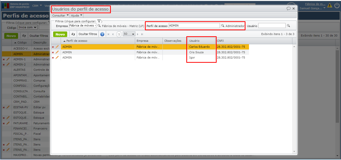 3) É aberta a tela de “Usuários do perfil de acesso” listando quais usuários possuem aquele perfil de acesso.