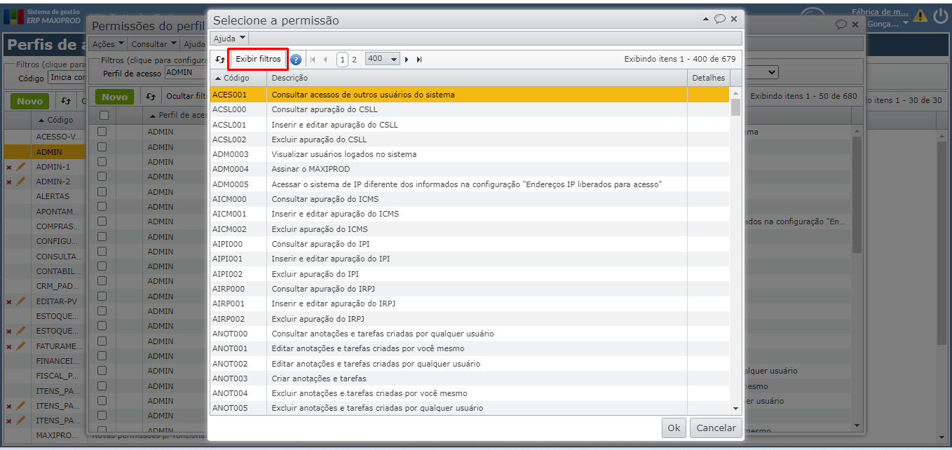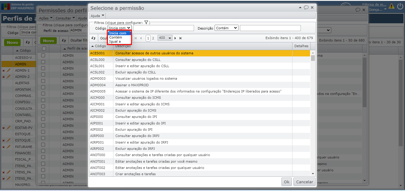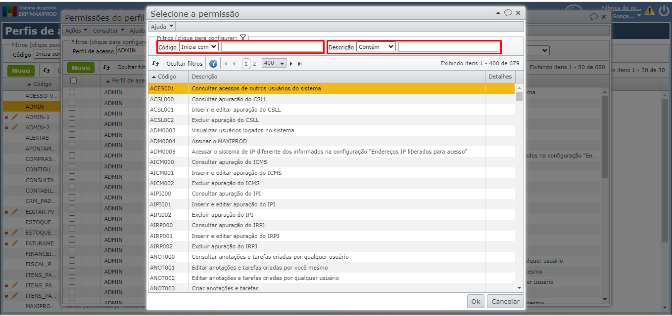 5) Utilize o filtro “Código” e/ou “Descrição” para se aproximar da permissão que deseja encontrar.