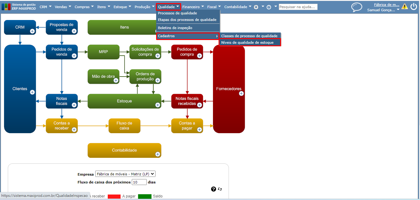 1) Acesse o menu superior “Qualidade > Cadastros > Níveis de qualidade de estoque”.