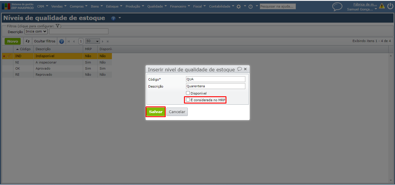 2) Clique no botão verde “Novo” para criar um novo nível de qualidade ou clique no ícone do lápis para editar um nível de qualidade cadastrado. Na janela aberta desmarque a opção “É considerada no MRP” e clique no botão verde “Salvar”.