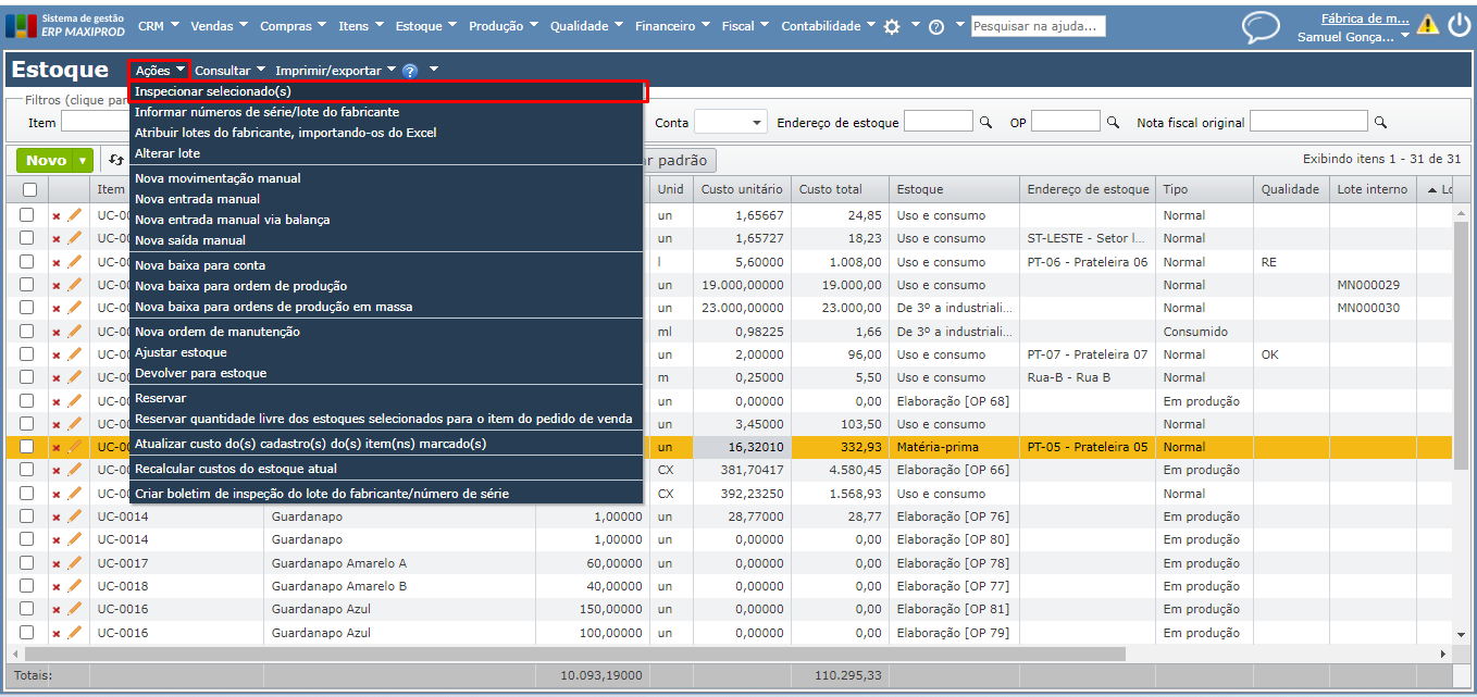 a) Para atribuir este nível de qualidade a um registro de estoque, acesse “Estoque > Estoque”. Selecione o(s) registro(s) de estoque, clicando sobre a sua linha, e a seguir acesse o submenu “Ações > Inspecionar selecionado(s)”.