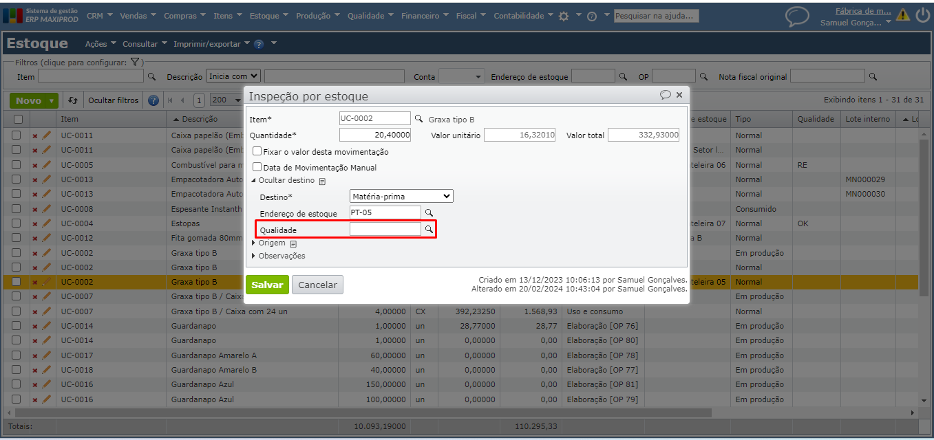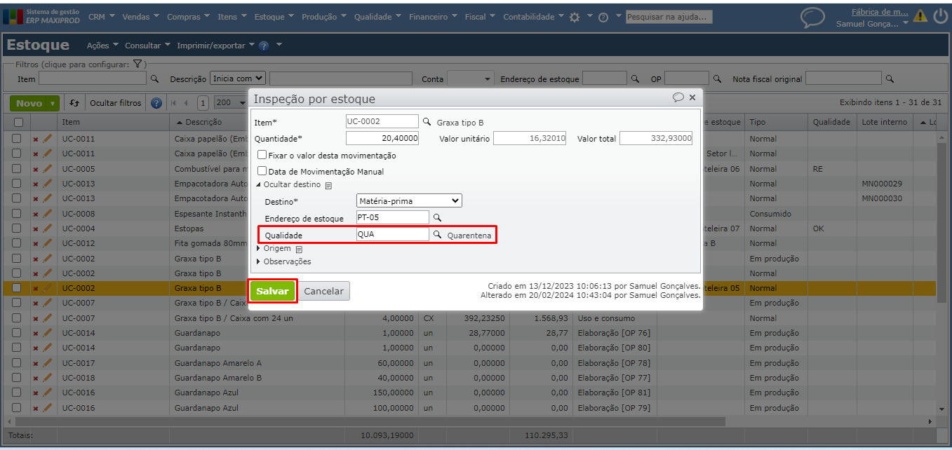 4) Assim que o estoque estiver disponível e puder ser considerado pelo MRP, faça nova inspeção e altere o campo “Qualidade” para um nível de qualidade considerado pelo MRP ou deixe o campo “Em branco”.
