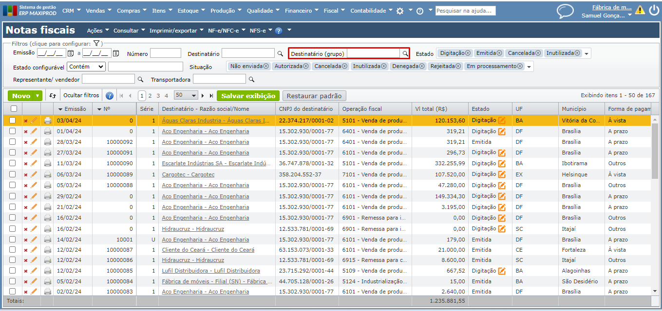 4) O sistema exibirá as NF dos destinatários/remetentes vinculados com aquela empresa Matriz.