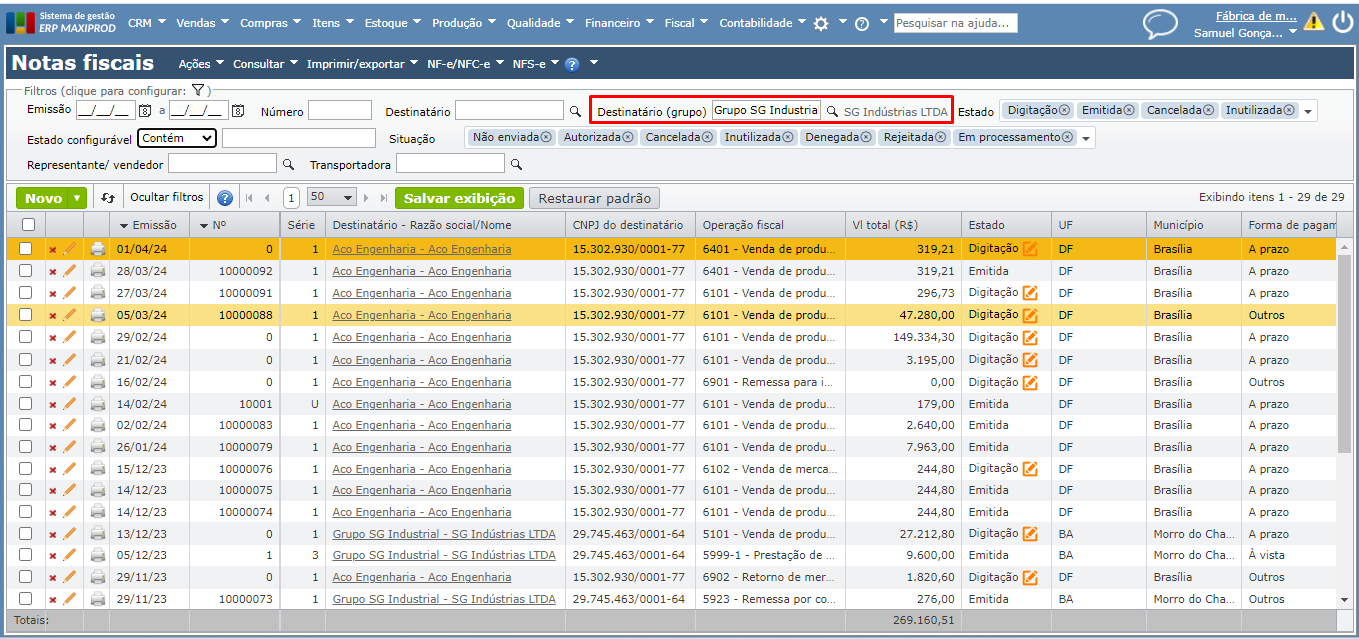 3) No filtro “Destinatário/remetente (grupo)” identifique a empresa, digitando ou selecionando pelo clique no ícone da lupa.