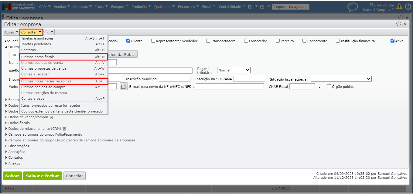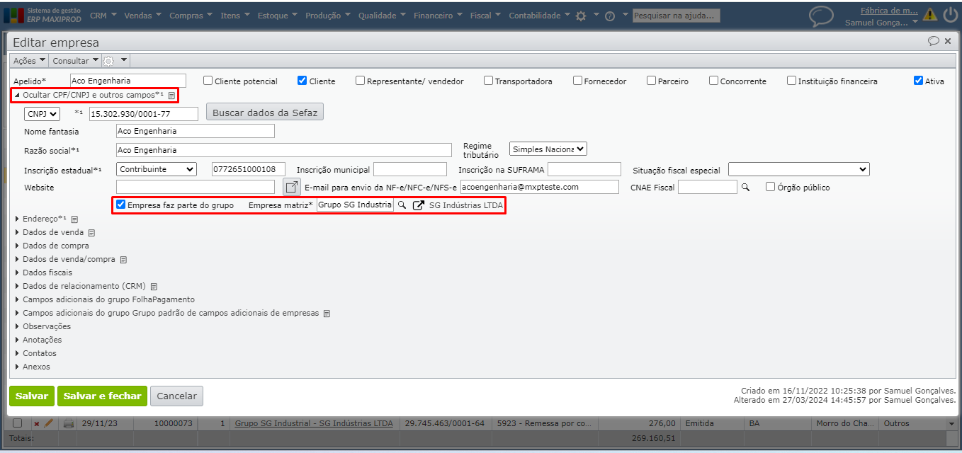6) A tela de edição da empresa permite consultar as últimas NFs emitidas ou recebidas. No caso da empresa matriz, o sistema exibirá todas as NFs das empresas filiais ou integrantes do grupo.