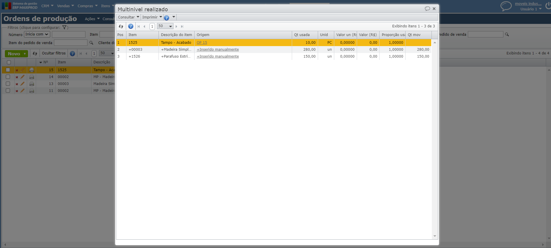 3) é aberta a tela “Multinível realizado“, que mostra os insumos utilizados na produção do item-pai, isto é, a estrutura multinível da OP.