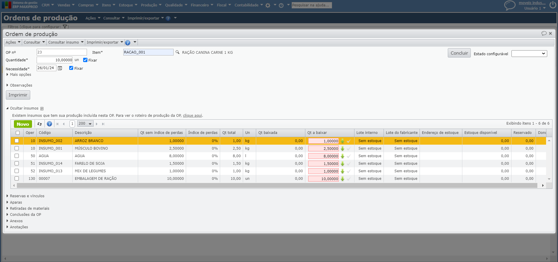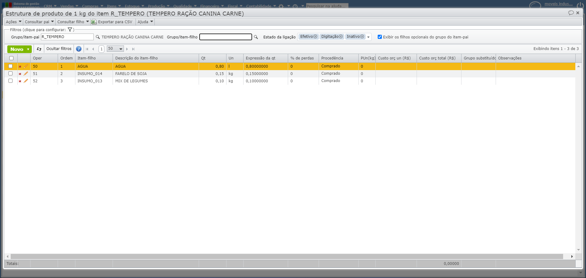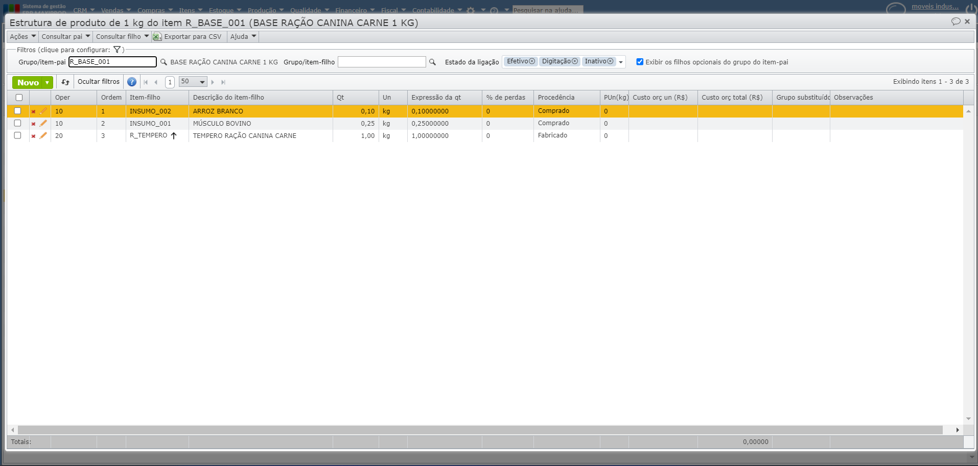 Ao produzir 10 unidades do item “RACAO_001”, as quantidades dos insumos associados ao item-filho “R_BASE_001” são multiplicadas por 10 e, por sua vez, as quantidades resultantes multiplicam a quantidade dos insumos do item “R_TEMPERO”, como mostra a imagem acima.