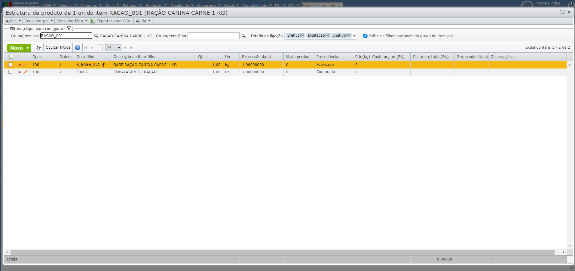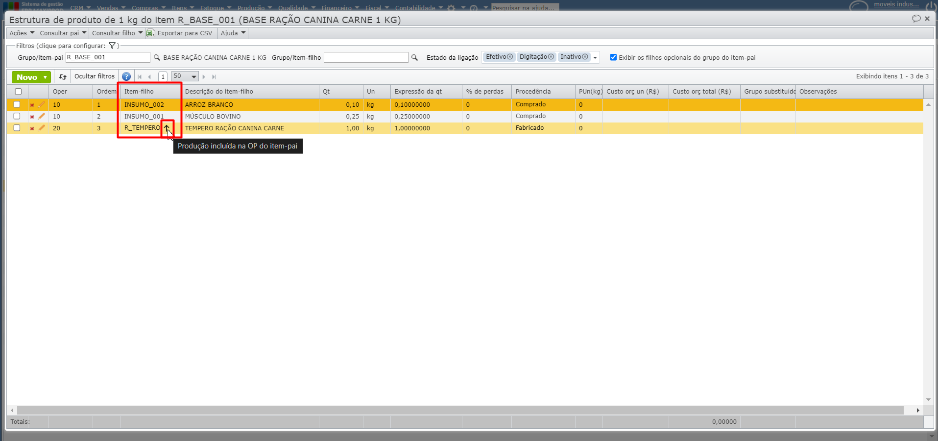 Neste caso, a quantidade a ser produzida da OP do item “RACAO_001” define a quantidade de cada insumo do item-filho “R_BASE_001”. Essa quantidade, por sua vez, afeta a quantidade dos insumos do “R_TEMPERO”.