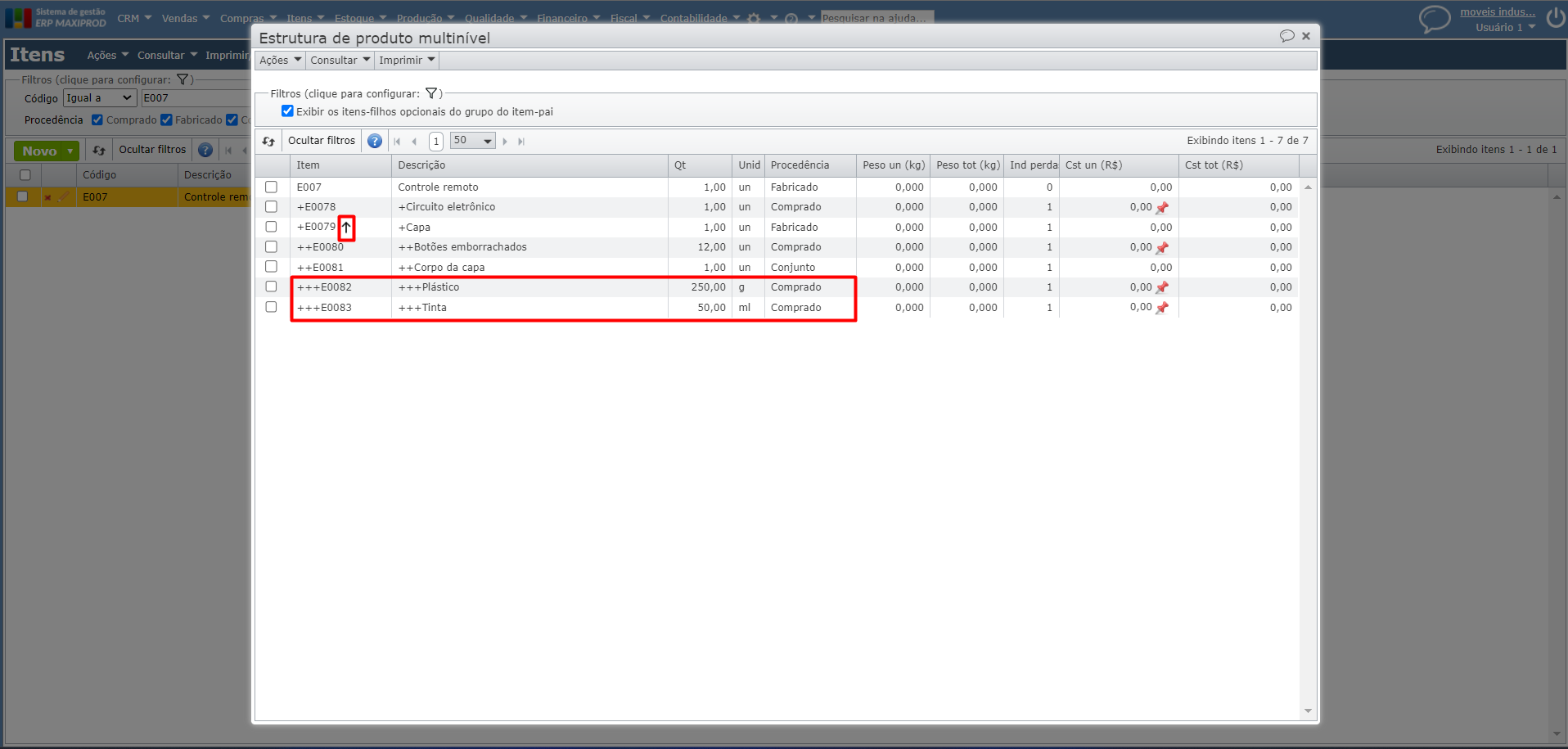 - Observação: nas estruturas de produto acima, há um item-filho com um ícone “seta preta” ao lado do código, na coluna “Item-filho”. Este ícone indica que a opção “Produção incluída na OP do item-pai” está marcada na estrutura de produto do item-pai.