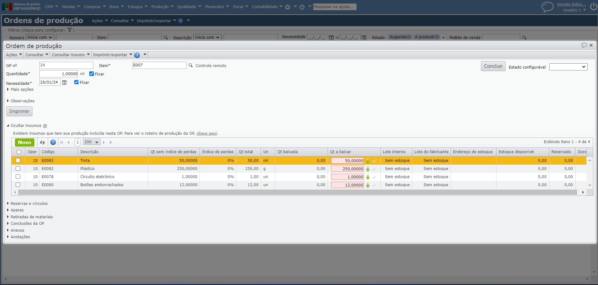 - o item “Capa” não aparece como insumo da OP do “Controle remoto” porque a propriedade “Produção incluída na OP do item-pai” do seu item-filho “Capa” está ligada na estrutura de produt.