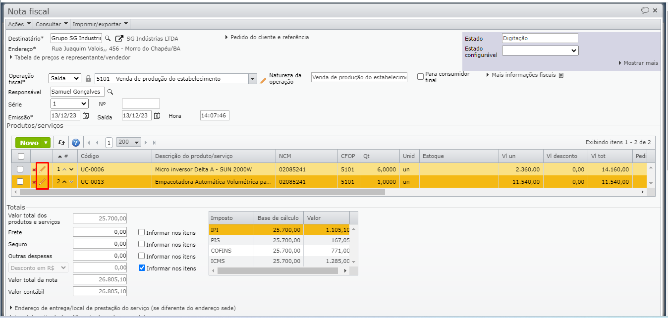 O preenchimento da nota fiscal pode ser iniciado através do pedido de venda, portanto, o passo a passo abaixo se aplica tanto a notas fiscais, quanto pedidos de venda ou propostas de venda. Para editar a operação fiscal, portanto o CFOP de um item, a proposta, pedido de venda ou nota fiscal precisa estar em “Digitação”.