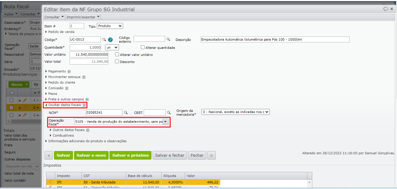 2) Na edição do item, expanda a seção “Dados fiscais” e altere a operação fiscal no campo destacado na imagem abaixo: