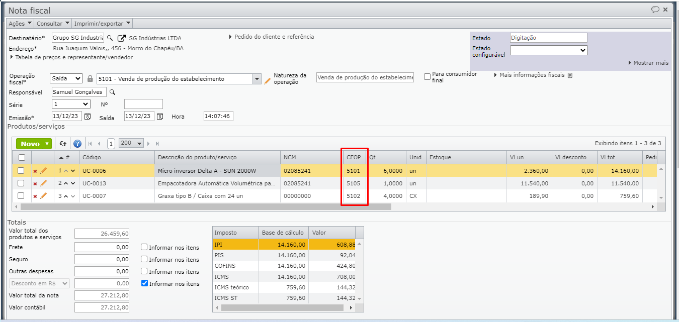 Uma nota fiscal pode incluir diferentes itens ou serviços, cada um associado a um CFOP. No ERP MAXIPROD, o CFOP é uma das propriedades da operação fiscal.