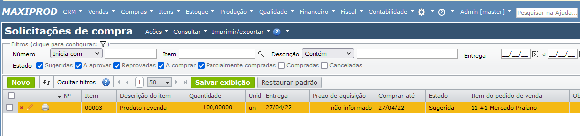 - Linha 2 (produção): descreve a solicitação de compra sugerida.