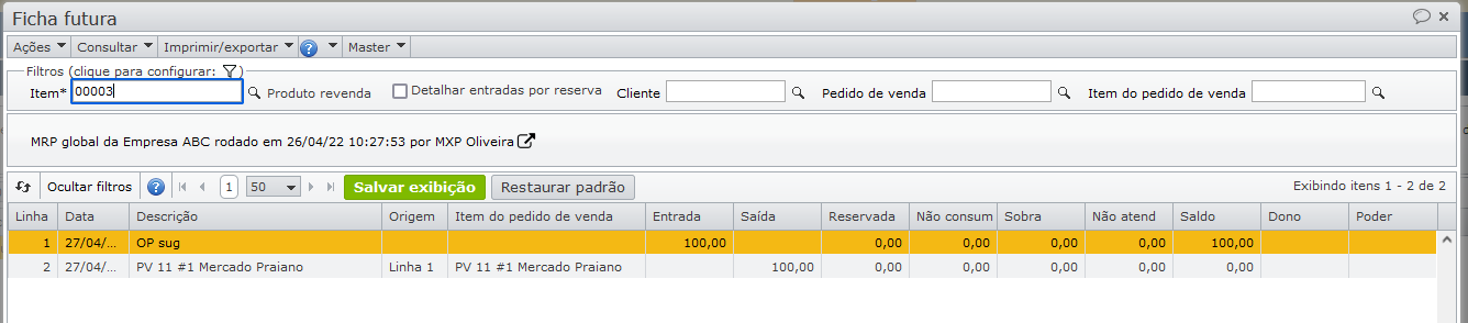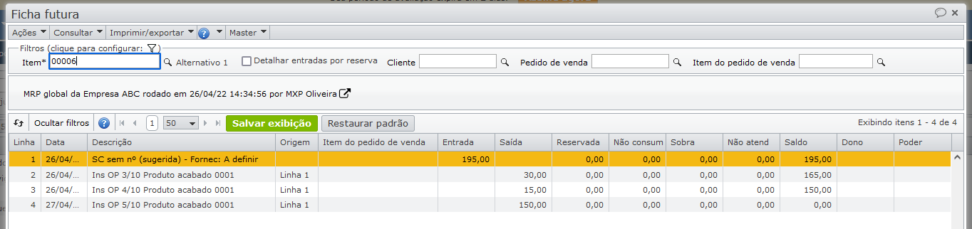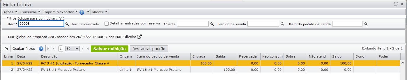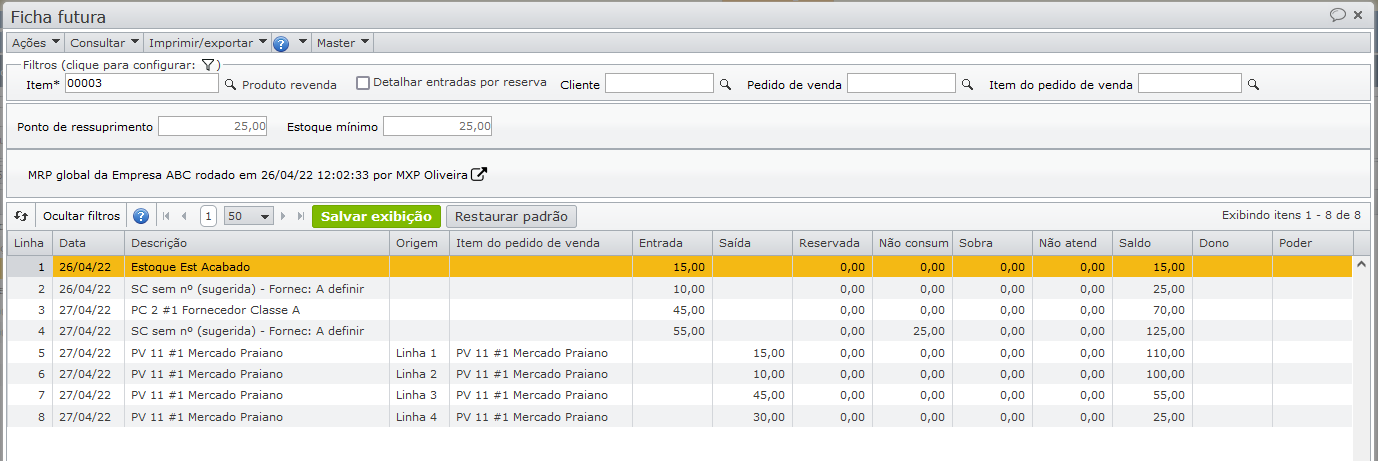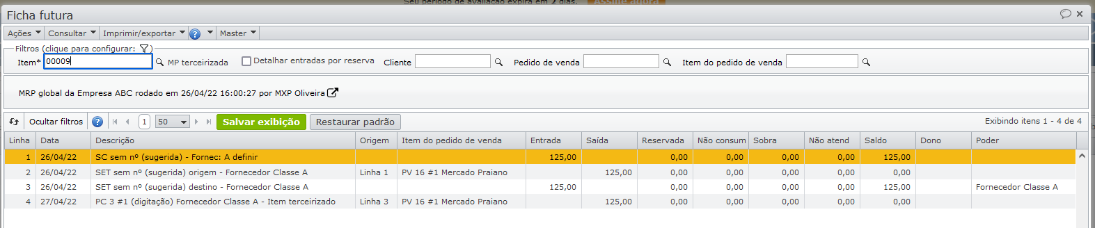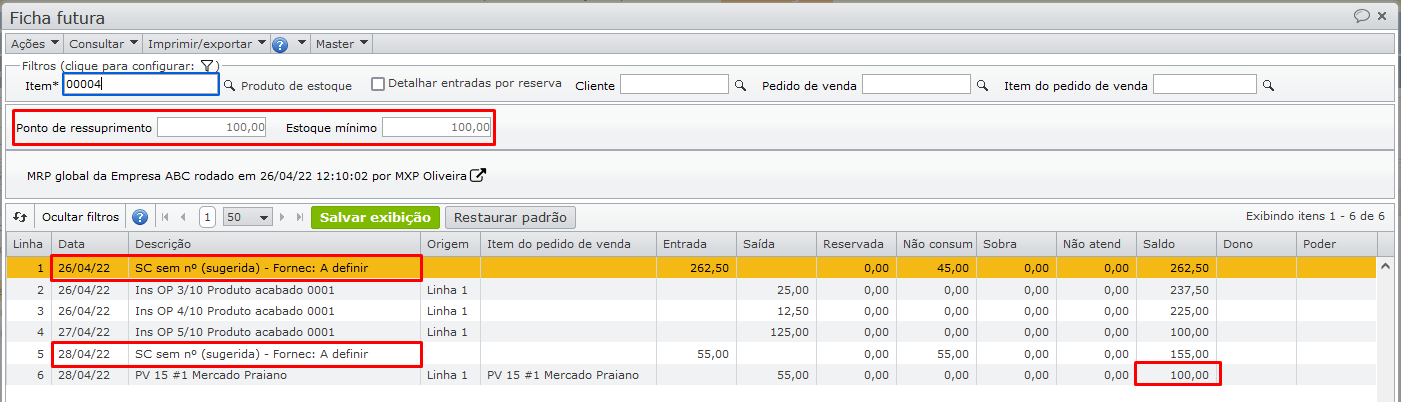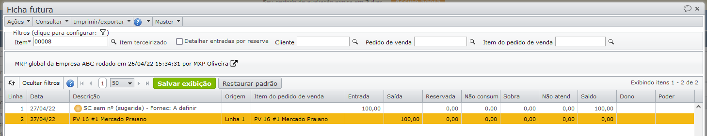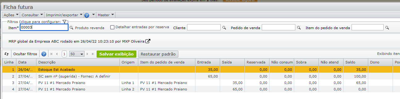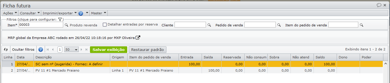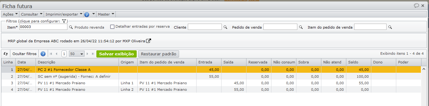 A ficha futura mostra que parte do pedido de venda será atendida pelo estoque (linha 3), e outra parte pela solicitação de compra sugerida (linha 4).