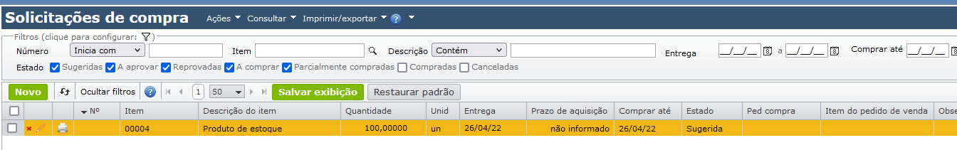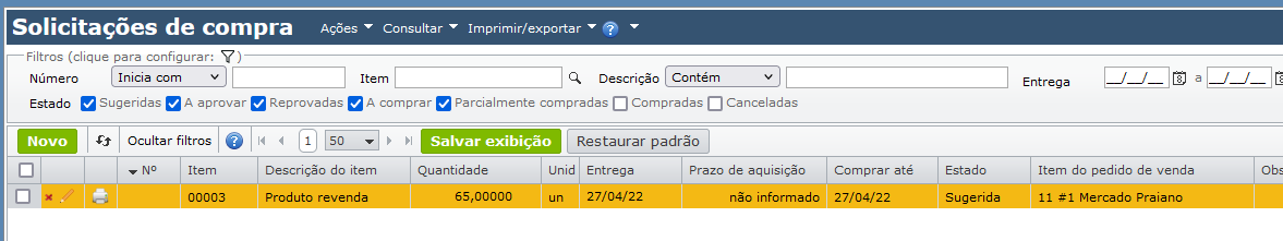 - A coluna “Entrada” mostra a quantidade da solicitação de compra sugerida, que entrará em estoque ao se converter em compra.