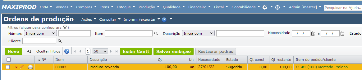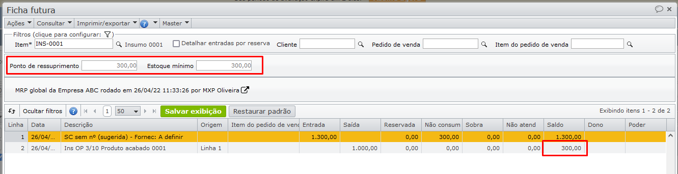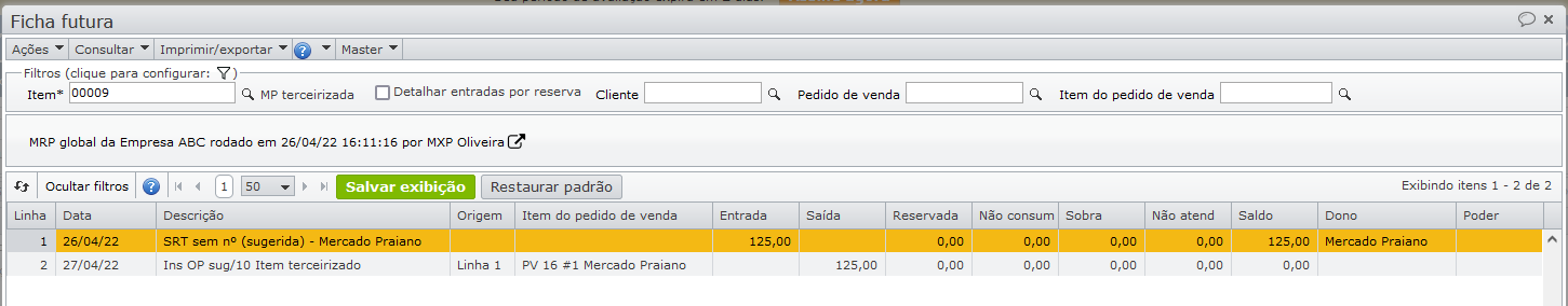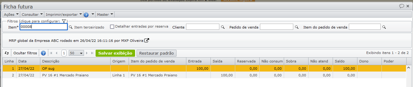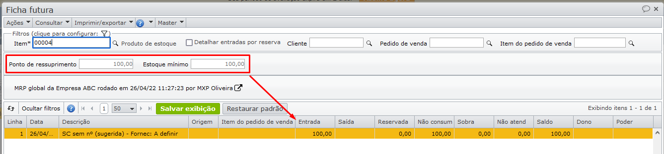 O resultado do MRP, apresentado na ficha futura, sugere uma solicitação de compra em quantidade igual à do pedido de venda.