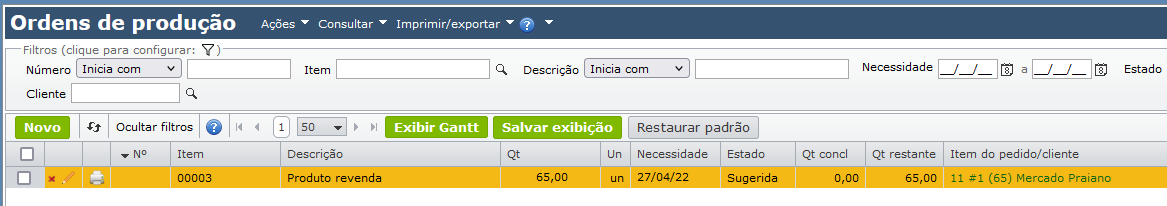 - A coluna “Origem” mostra a linha de origem da quantidade consumida; a quantidade total da OP sugerida atenderá o pedido de venda.