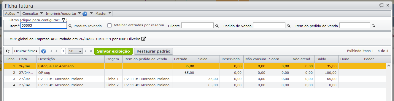 A ficha futura mostra que uma parte do pedido de venda será atendida pelo estoque (linha 3) e o resto pela ordem de produção sugerida (linha 4).
