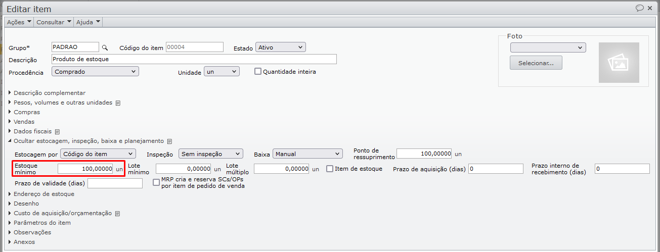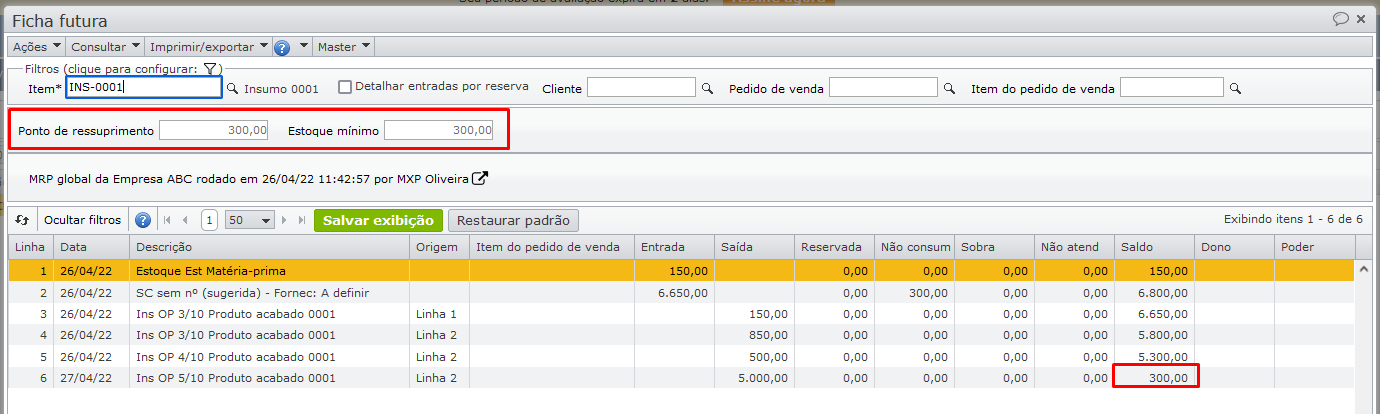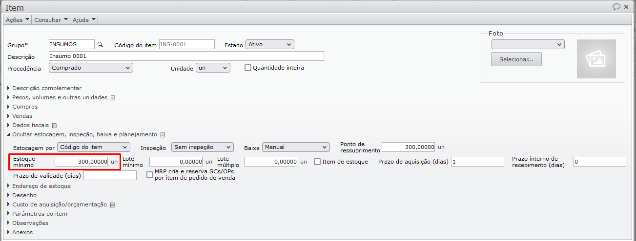 Observe que o saldo final é igual ao estoque mínimo especificado para o item.