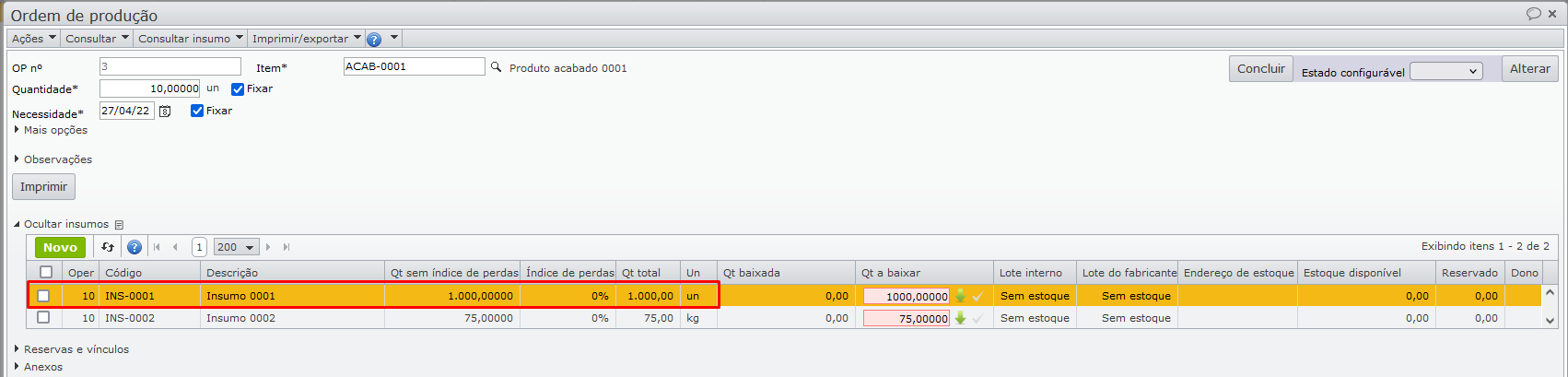 - Linha 2 (consumo): descreve o consumo do item como insumo em uma ordem de produção que ocorrerá.