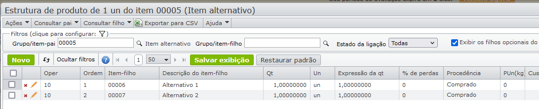 Este item-filho representa um conjunto de itens alternativos que podem ser consumidos na execução da produção do item-pai.