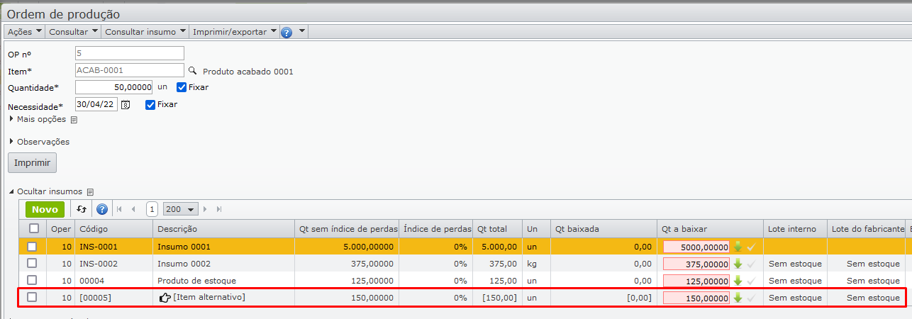 - Linha 4 (consumo): descreve o consumo do item como insumo da mesma OP da linha 3.