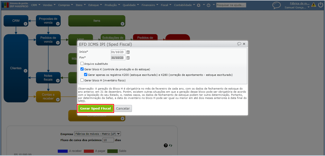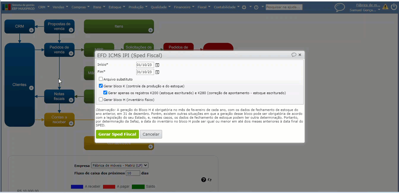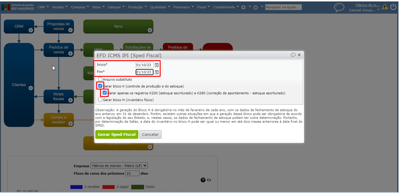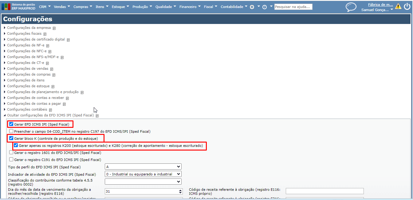 Se a empresa não precisa gerar o bloco K completo, mas somente os registros K200 (estoque escriturado) e K280 (correção de apontamento – estoque escriturado), o ERP MAXIPROD oferece uma opção que gera o SPED Fiscal somente com esses registros.