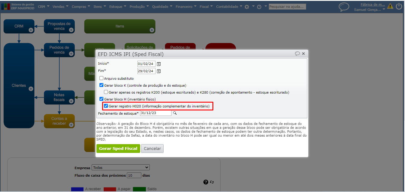 1) Para gerar o registro H020, é necessário marcar a opção “Gerar bloco H (inventário físico)” na janela de geração do SPED Fiscal disponível ao acessar “Fiscal > EFD ICMS IPI (Sped Fiscal)”.
