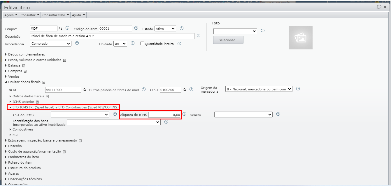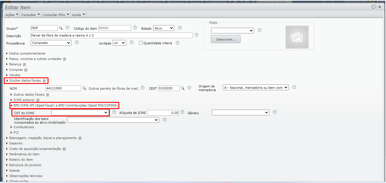4) No cadastro dos itens, seção “Dados fiscais > EFD ICMS IPI (Sped fiscal) e EFD Contribuições (Sped PIS/COFINS)” o campo “CST do ICMS” deve ser preenchido, para o item ser considerado na geração do registro H020 do Sped Fiscal.