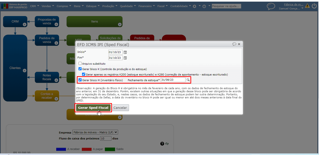 5) Ao clicar em “Gerar Sped Fiscal”, é gerado o arquivo com o bloco H referente ao fechamento de estoque selecionado.