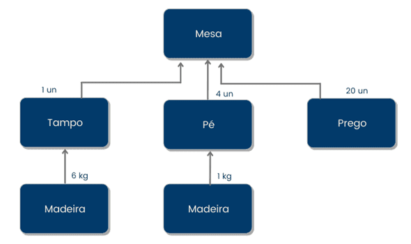 A forma mais simples de apresentar uma estrutura de produto é através da associação direta entre o produto fabricado e os seus insumos comprados. A estrutura de produto de uma MESA poderia ser mostrada assim: