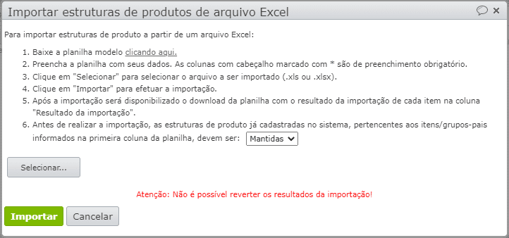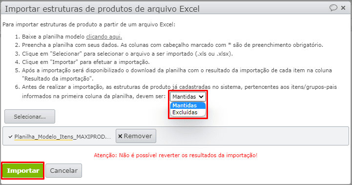 - “Mantidas”: Se for selecionada, assim que clicar em “Importar”, os itens/grupos-filhos, informados na coluna B da planilha, serão acrescentados às estruturas de produtos dos itens/grupos-pais informados na primeira coluna.