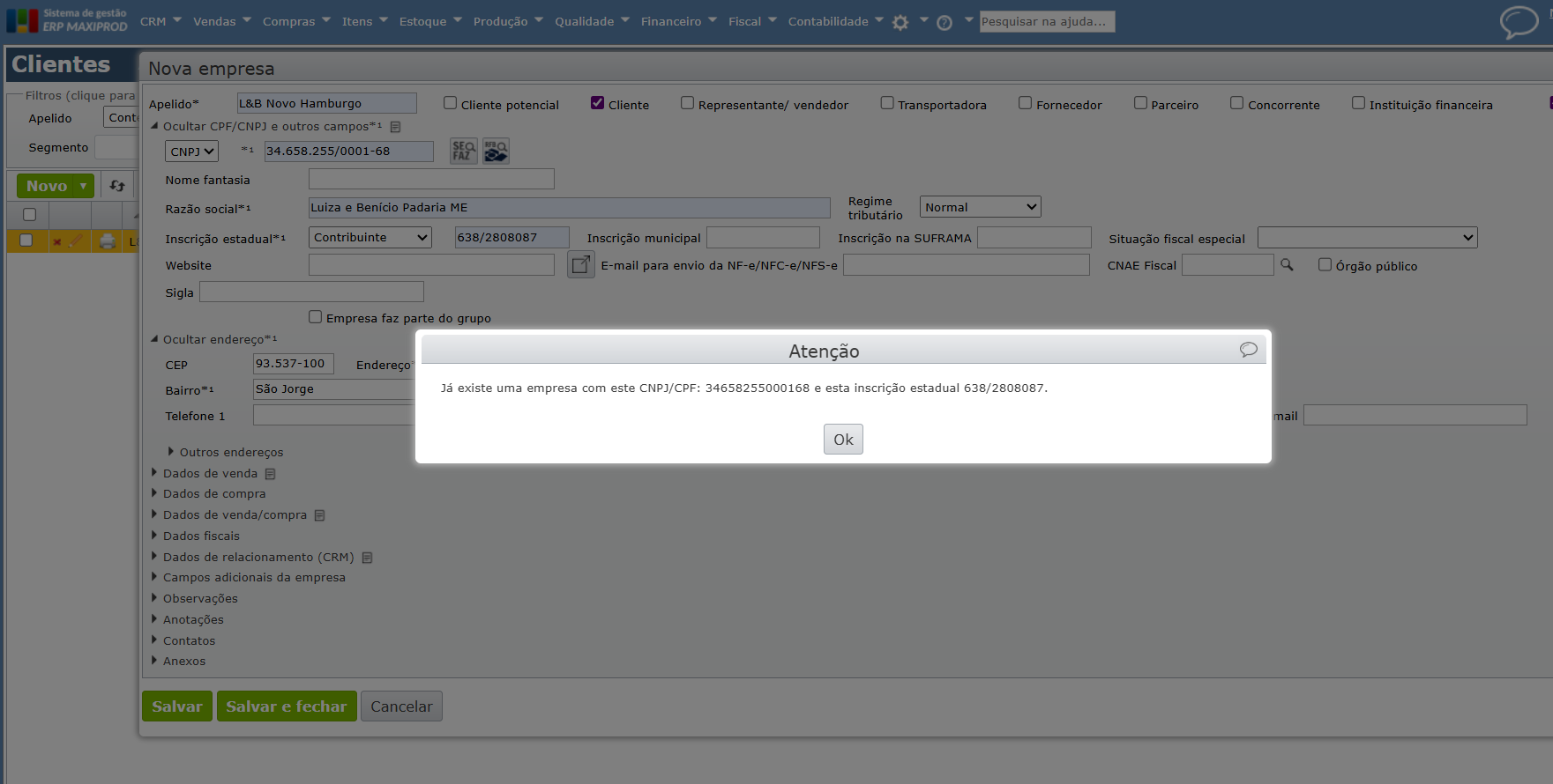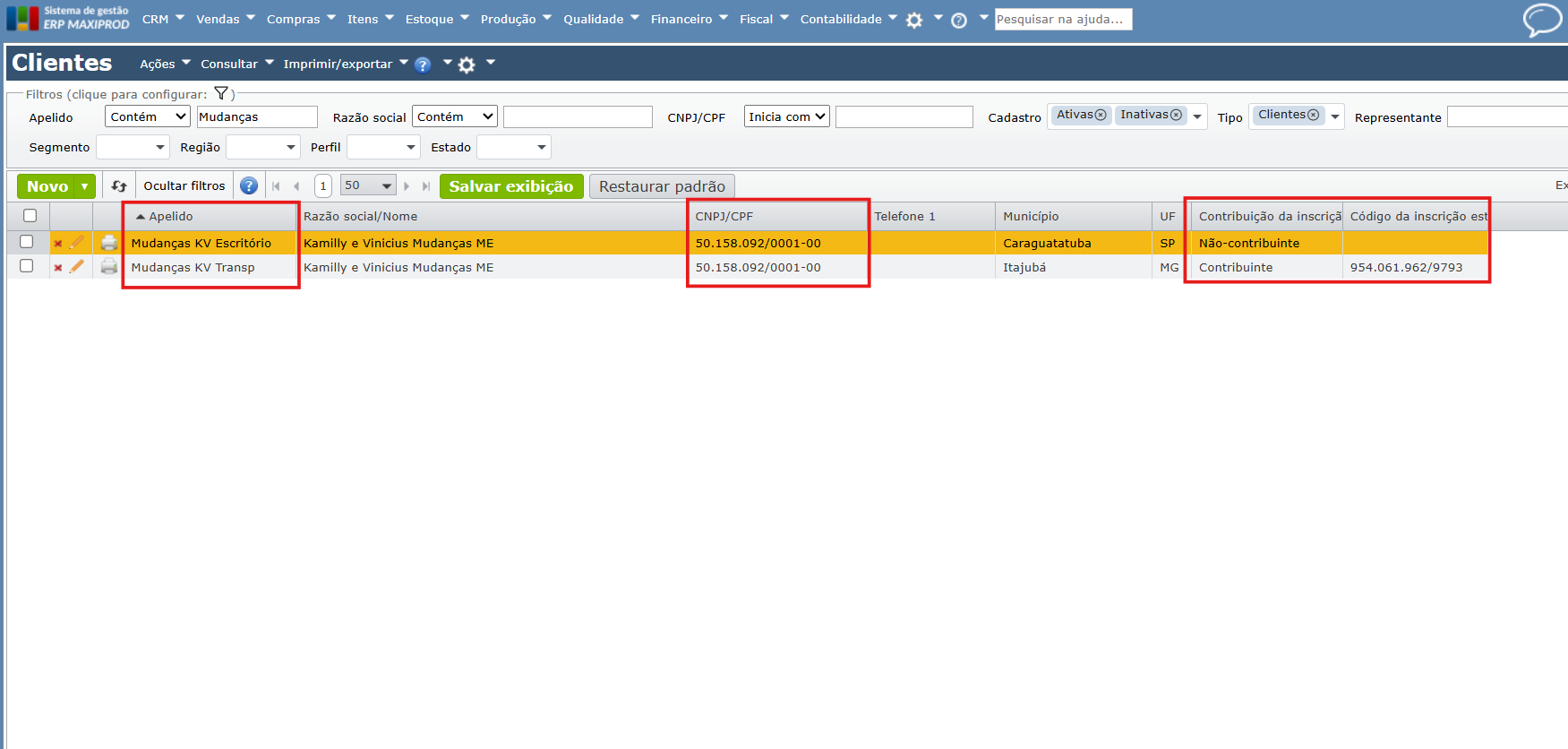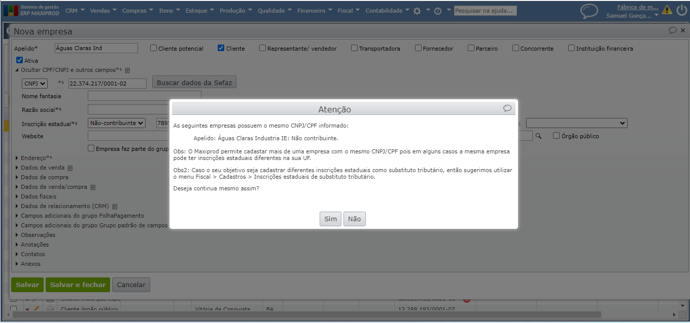 Obs: O Maxiprod permite cadastar mais de uma empresa com o mesmo CNPJ/CPF pois em alguns casos a mesma empresa pode ter inscrições estaduais diferentes na sua UF.